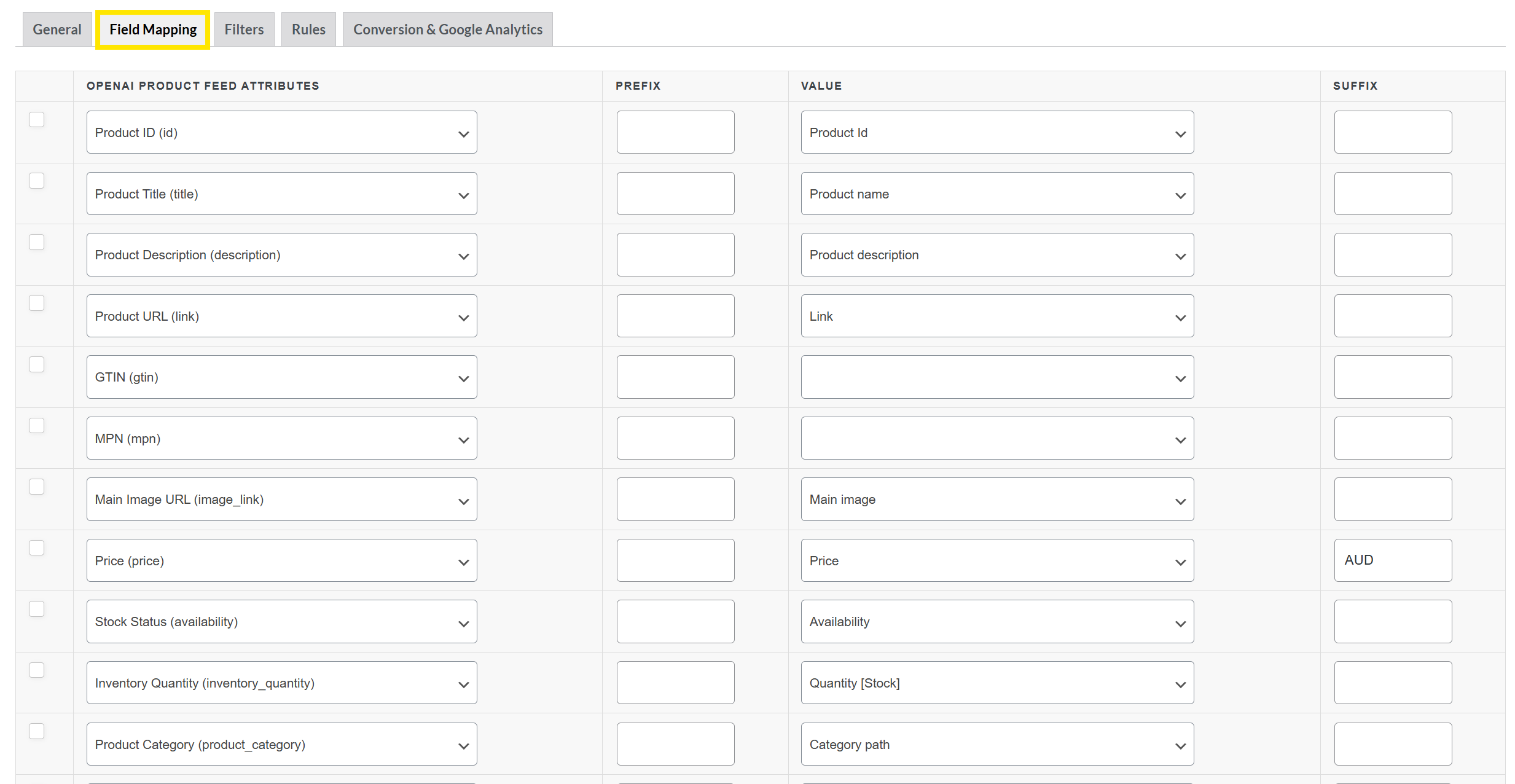 Thankfully, AdTribes maps the required and recommended fields for you, so there’s no need to start from scratch. In the Field Mapping page, you’ll notice that most OpenAI product attributes already have matching values from your WooCommerce store: