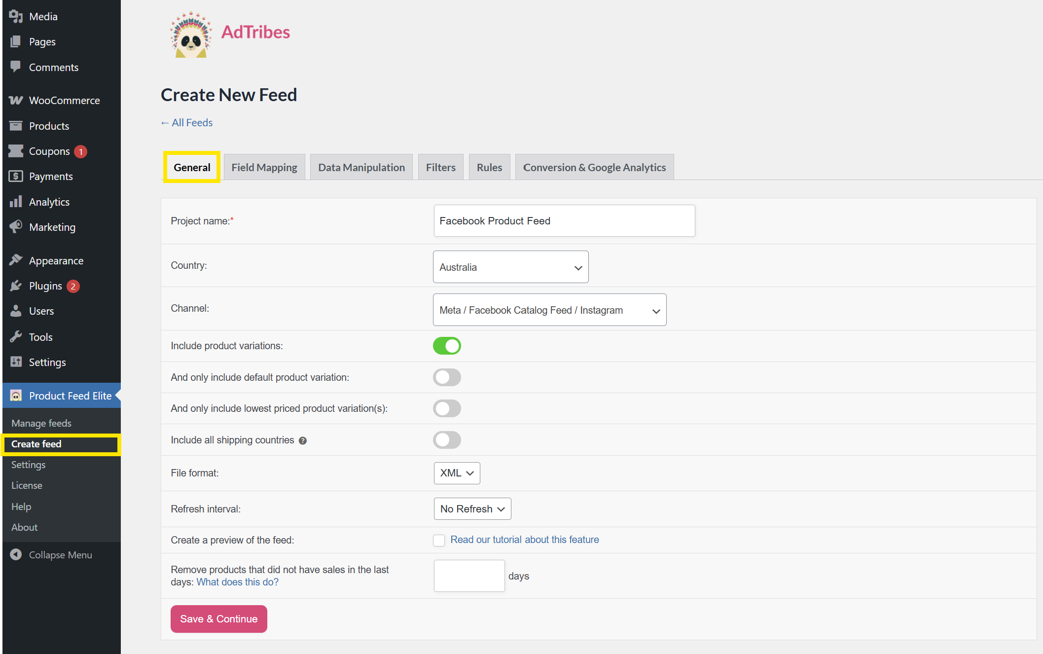 To create a new product feed, head to Product Feed Elite > Create Feed. This will take you to the product feed creation screen. Set up your feed as usual by filling in the basic feed details under the General Tab: