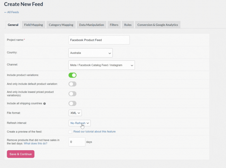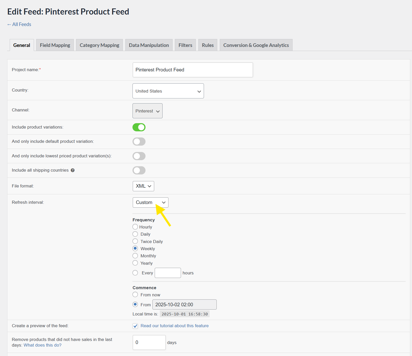 After configuring your custom schedule, you can continue setting up your feed as usual. This includes applying filters and rules, mapping fields, and enabling conversion tracking.
