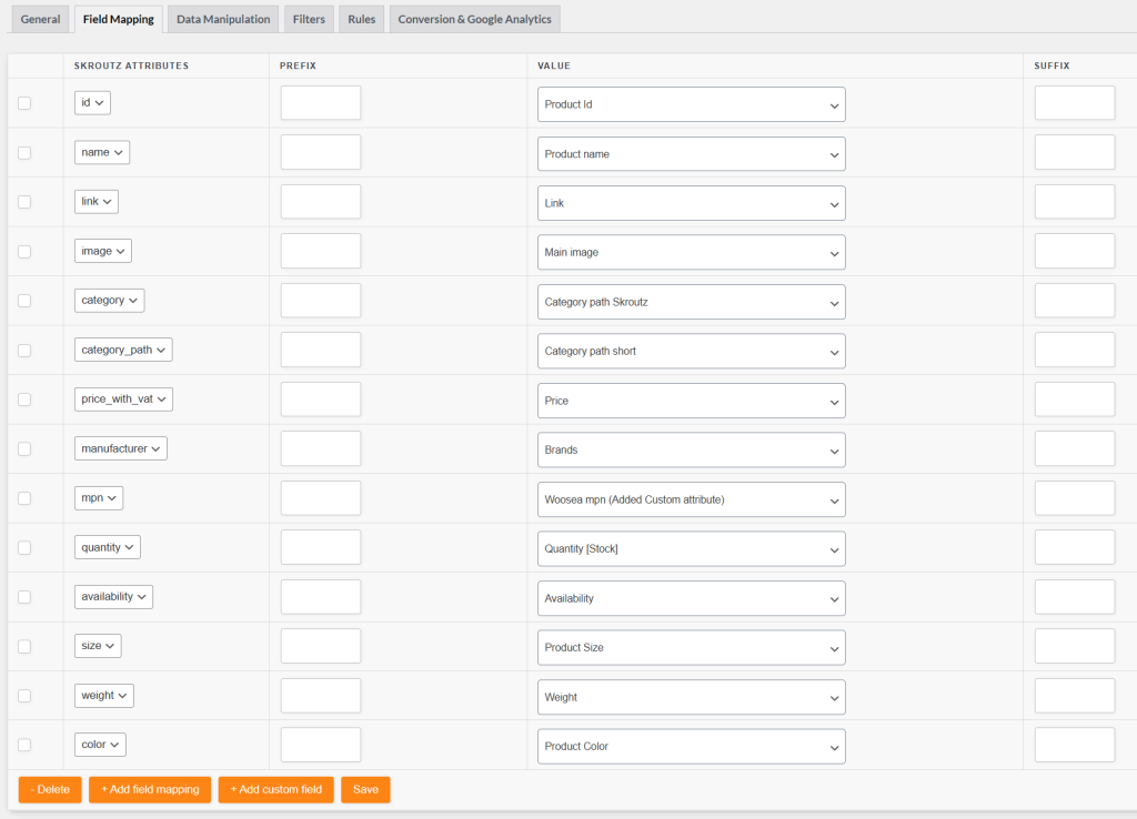 - Add additional field via “+ Add Field Mapping” (e.g., additional_imageurl, shipping_cost). Follow Skroutz’s product data specification.