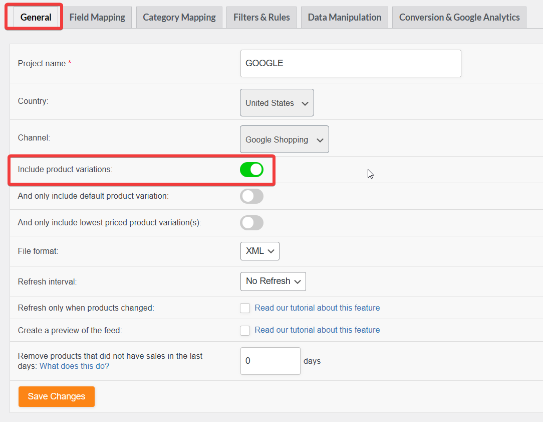 If your store contains both simple and variable products, and you want to include both in your product feed, make sure the “Include product variations” option is enabled.