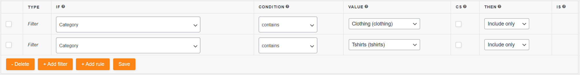 One common issue arises when you try to include multiple categories using the include_only filter more than once within a single feed configuration. For example, if you want to include Clothing and Tshirts, you might create a configuration like: