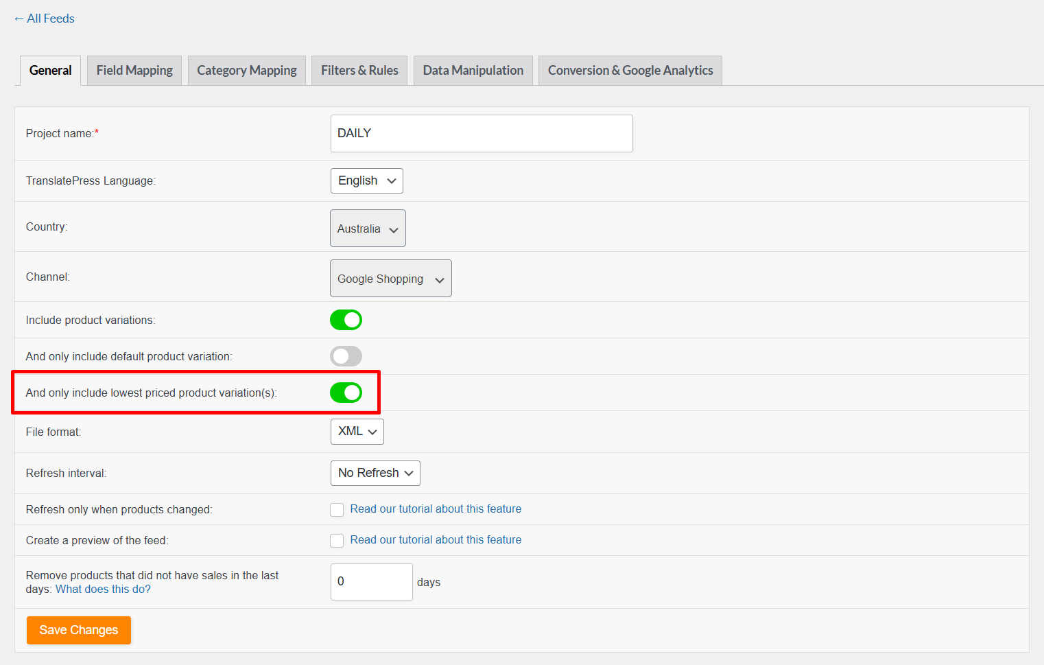 - Both “Only include default product variation” and “Only include lowest priced variation(s)” are enabled