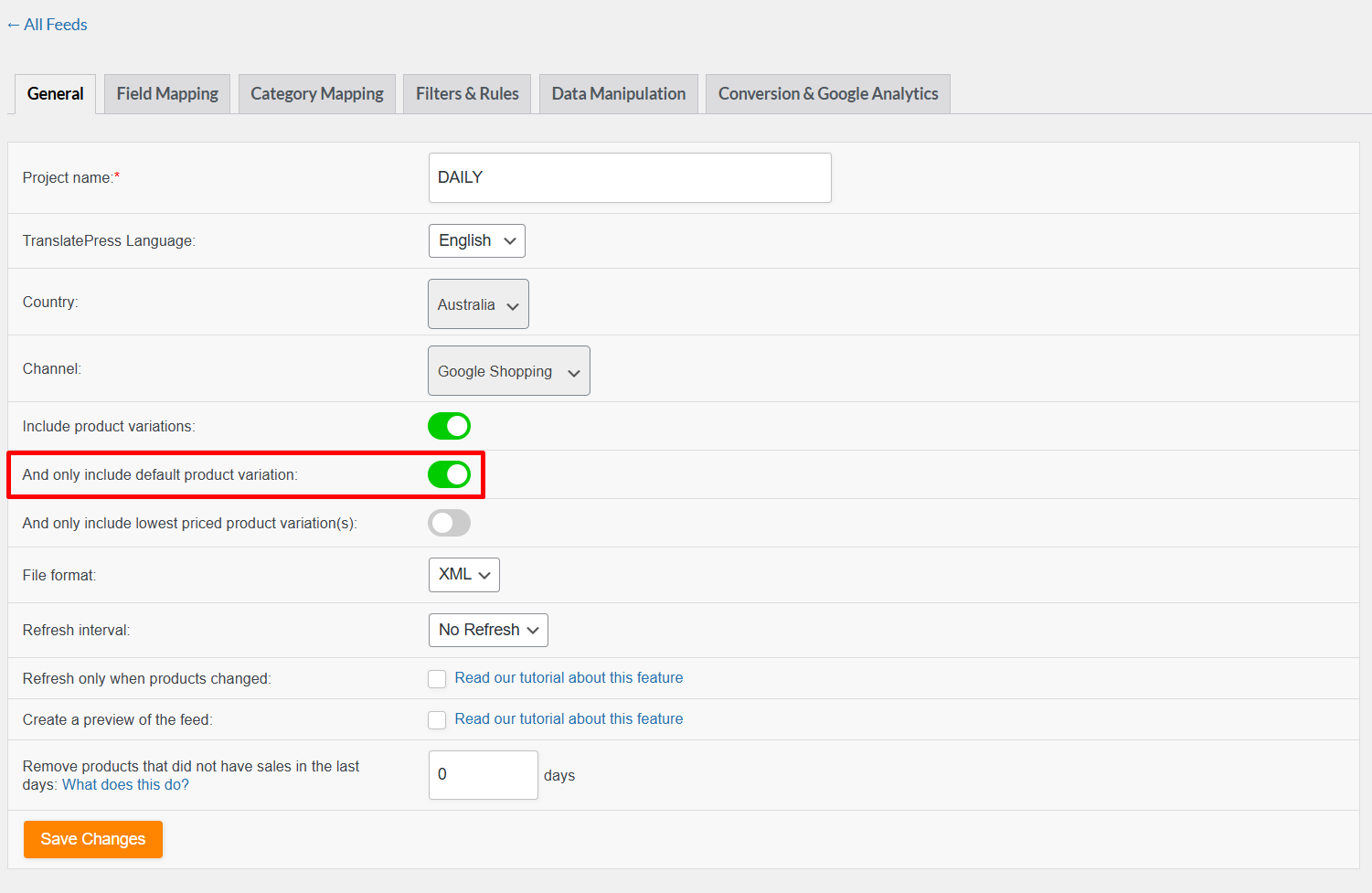 - “Only include default product variation” is enabled