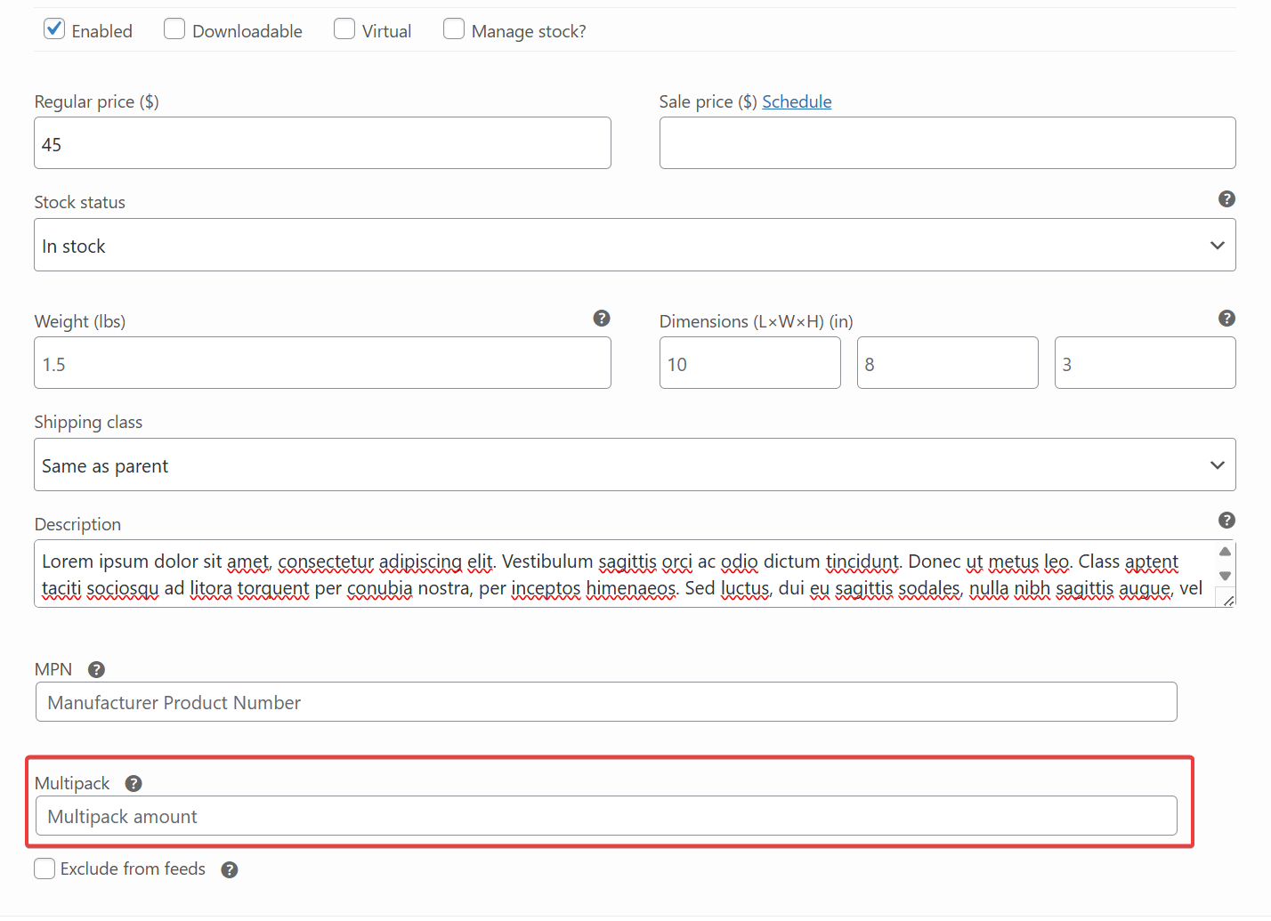 This will add the Multipack input field to your product and variation pages.