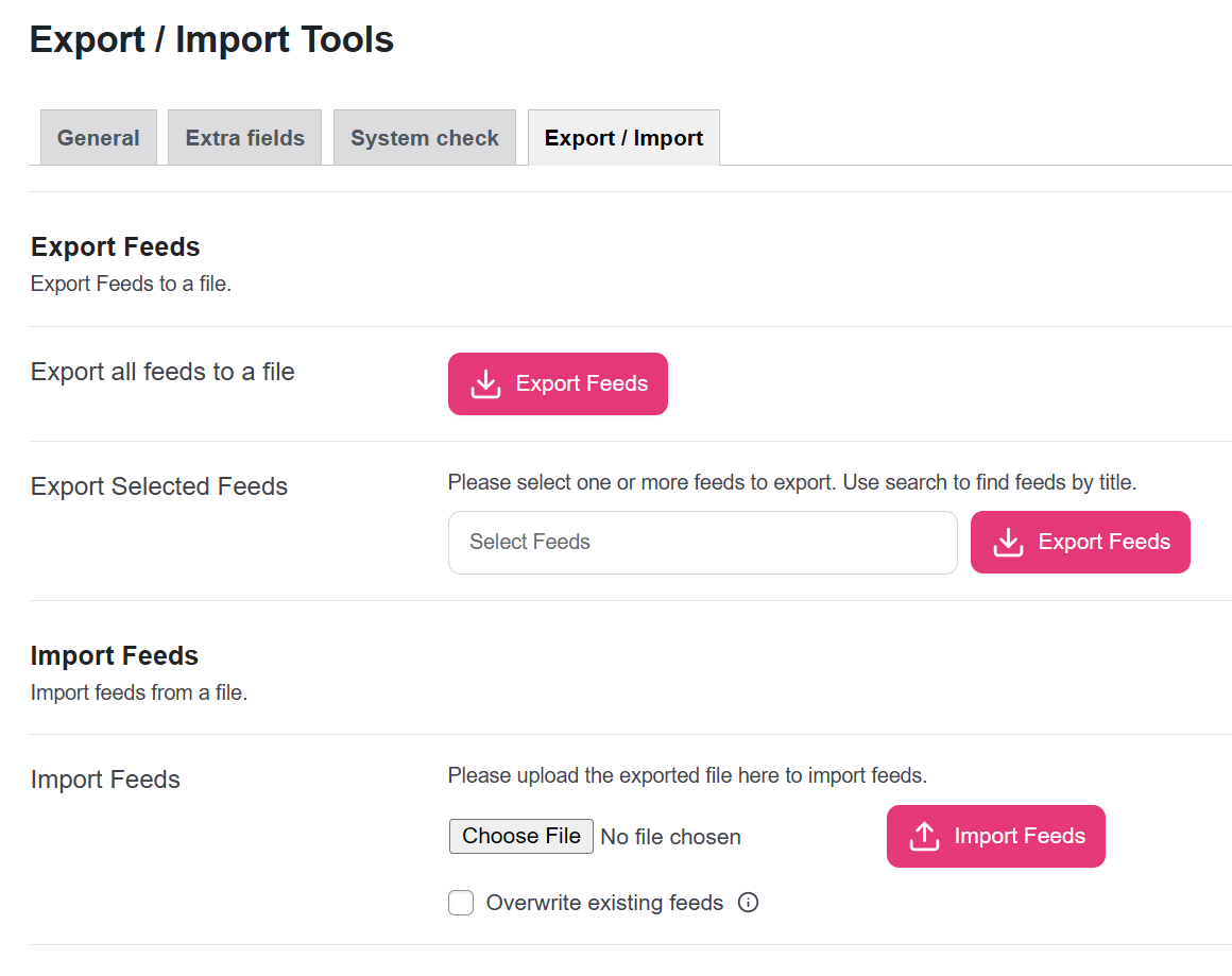 file exported from Product Feed Pro or Elite. - (Optional) Check Overwrite existing feeds if you want to replace feeds that already exist. It will preserve critical details like feed status and the last updated date.