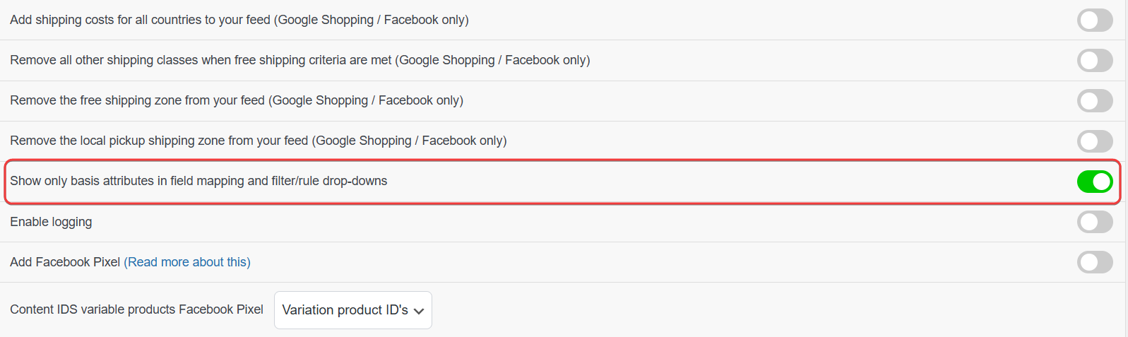 When configuring product feeds in Product Feed Pro or Product Feed Elite, you may notice a setting called “Show only basic attributes in field mapping and filter/rule drop-downs” in the plugin settings. This option controls which attributes appear in the attribute selection dropdowns throughout the plugin, specifically in the Field Mapping tab and in the Filters and Rules builders.