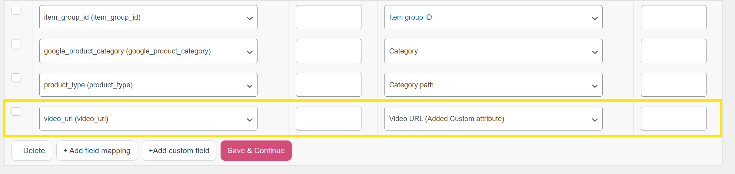 - From the left dropdown (under Meta/Facebook Catalog Feed Attributes), select video_url (video_url)