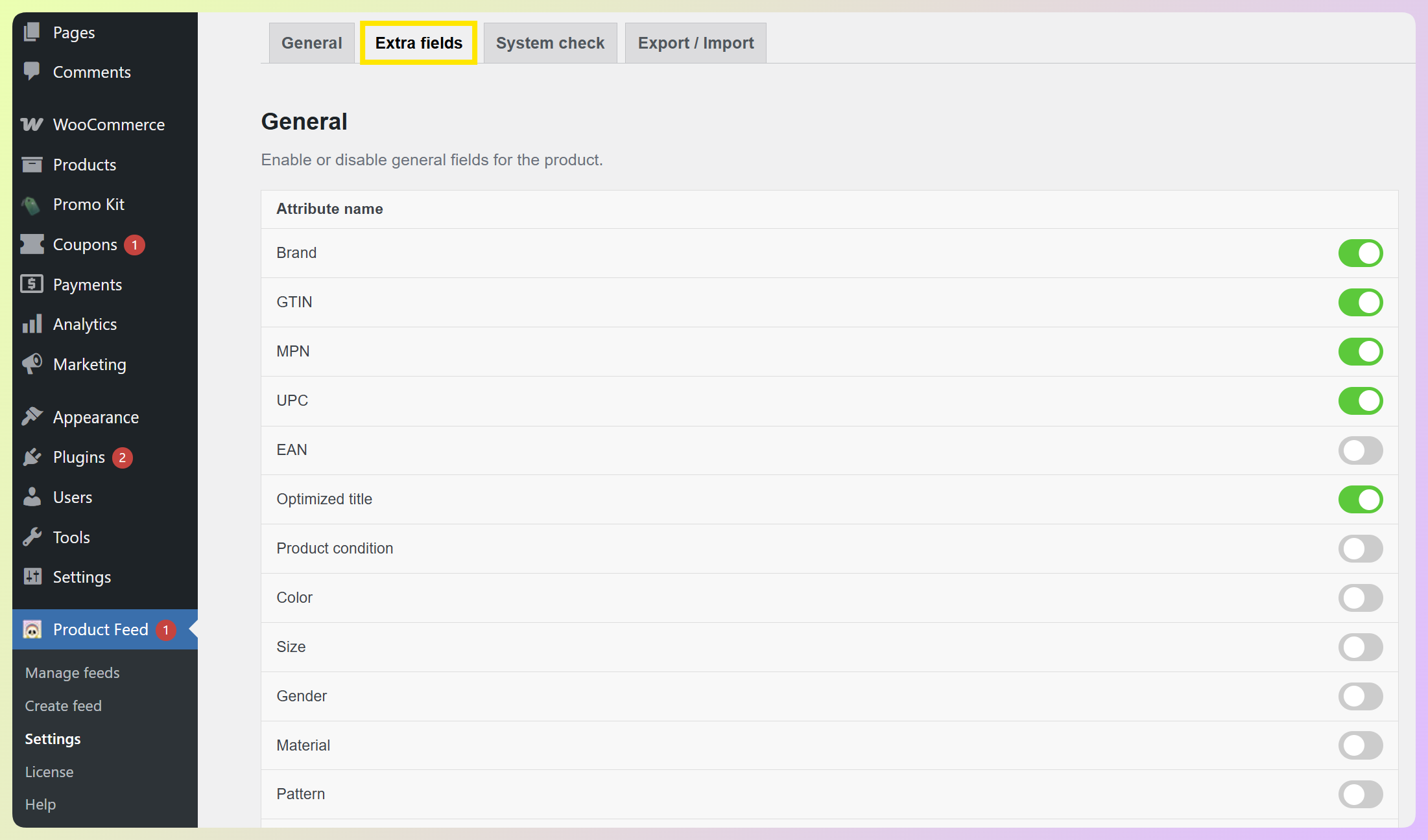 If your WooCommerce store does not already store that data, AdTribes Product Feed Elite includes WooCommerce Extra Product Fields, which lets you add fields like GTIN, MPN, UPC, EAN, Brand, and more to your products. Once enabled, those values can be mapped directly in the Field Mapping step so they are included in the feed for channels that need them.